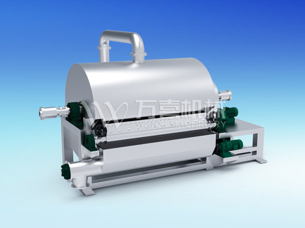 滾筒干燥機是一種內加熱傳導型轉動連續干燥設備。旋轉的滾筒通過其下部料槽,粘附著一厚度的料膜,熱量通過管道輸送至滾筒內壁,傳導到滾筒外壁,再傳導給料膜,使料膜中的濕得到蒸發、脫濕,使含濕分的物料得到干燥。干燥好的物料被裝置在滾筒表面的刮刀鏟離滾筒,到置于刮刀下方的螺旋輸送器,通過螺旋輸送器將干物料集中、包裝。