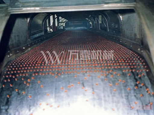 裝置將熔融液均勻在其下方勻速移動(dòng)的鋼帶上,在鋼帶下方設(shè)置的連續(xù)噴淋裝置的冷卻作用下,使物料在輸送、移運(yùn)過(guò)程中得到冷卻、固化、包裝,從而達(dá)到造粒成型的目的。